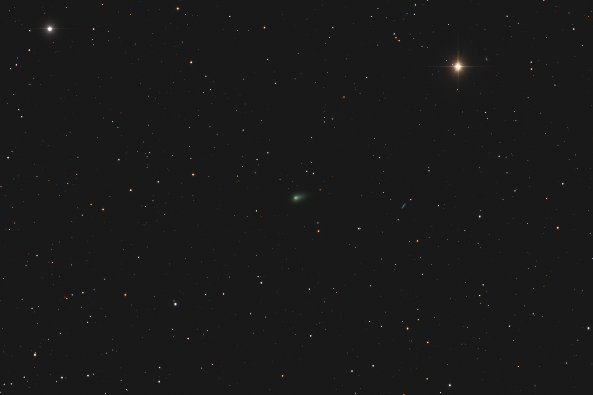 The comet looks rather faint here as the time lapse (including numerous satellite trails) is made from individual sub-exposures; the still images above show the result of stacking subs with the resultant improvement in image quality.