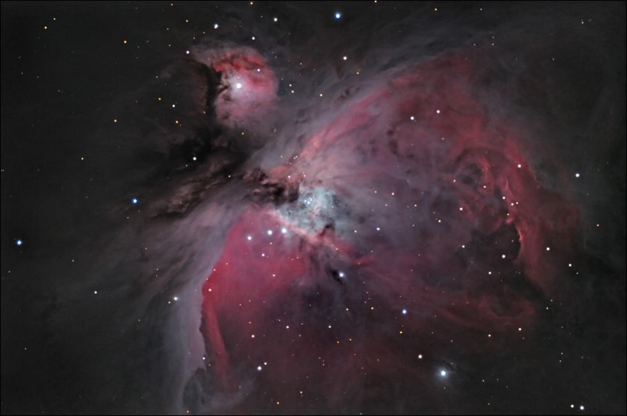 Below, a deeper view made with the same scope at 560mm focal length. The open cluster at top is NGC 1981. Click on the image for a larger version.