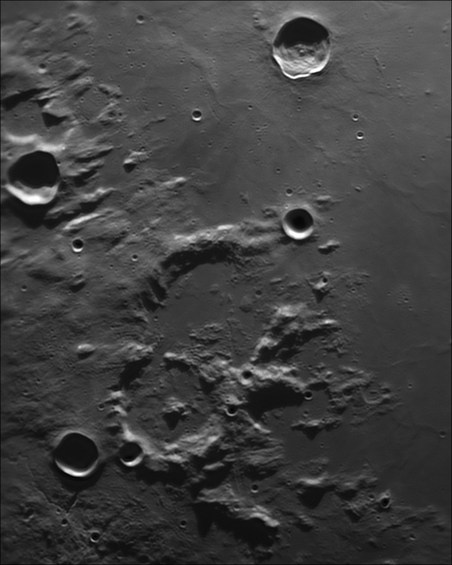 Pallas (46 km) is the lower of the two large craters; Murchison (57 km) is to Pallas's upper right. The image also shows shows part of Sinus Medii at right and top.