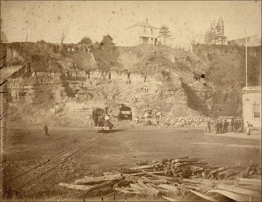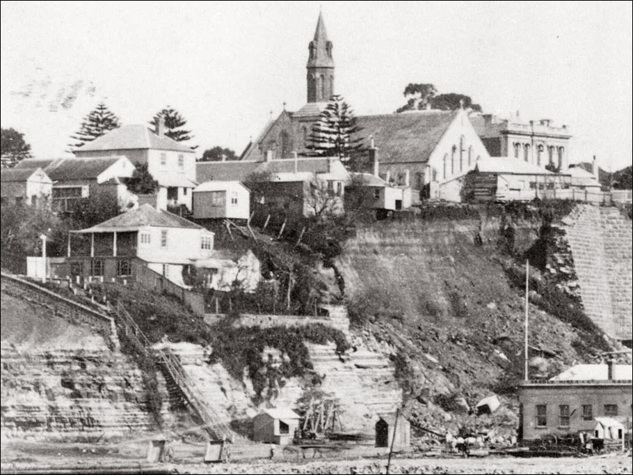 Nor is there any sign in the 'then' image of 'Jacob's Ladder', the stairway from Customs Street to Emily Place atop Point Britomart visible at left in the picture above; this absence, and the locomotive and tunnels seen in the 'then' image, seem to be explained by the 1884 newspaper report below: