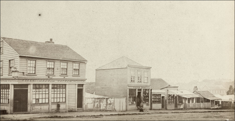 The corner of Federal (then Chapel) Street is at left. The Aurora Tavern, seen at left in the 1860s picture, seems to have been first mentioned in newspapers of the period in 1853. In the 1860s photograph the proprietor's name over the door is P.Coyle; he is first mentioned in the local press in connection with the tavern in 1866.1 (In 1865 the proprietor was given as one Patrick South in another newspaper report.2) In July 1868 Coyle announced that he was leaving the Aurora Tavern and setting up another establishment, the Sportsman's Home - see below.3 It's likely then that the 1860s photograph was taken between 1866 and '68.