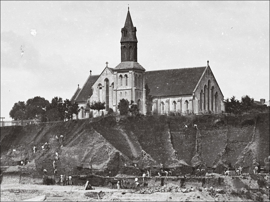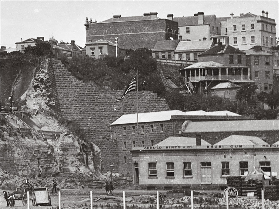 The demolition of Point Britomart, which had begun in the 1870s, was advancing toward St Paul's church near the top of Shortland Street (seen here at centre) by the time of this Burton Brothers photograph. The date must be later than 1883 as this picture was clearly made some time after a photograph of the waterfront made in that year (of which there is a then-and-now treatment on this site here). And the date can be no later than 1885 as it was in that year that St Paul's church was demolished.