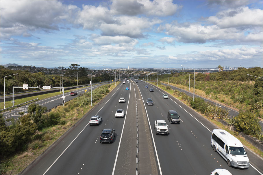 A 16-minute time exposure of a busy motorway. Click on the image to toggle a conventionally brief exposure of the scene.