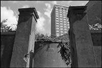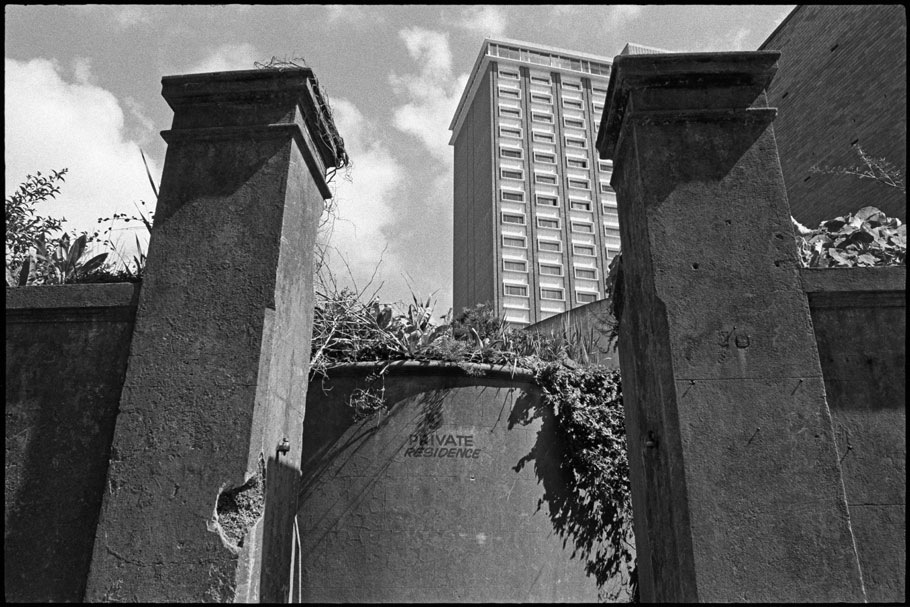 Panoramas composed of multiple individual frames digitally "stitched" together, in these cases from black and white negatives made between 1973 and 1976. In the '70s the possibility of creating panoramas in this way lay far off in an undreamed-of digital future. Back then all that could be done was to trim and mount prints side-by-side, but this led to jarring changes in perspective — which was inevitably rectilinear — from print to print. The only way to achieve the seamless cylindrical perspective of these digital panoramas that was available in those days was to use purpose-built specialized (and pricey) rotational panoramic cameras. Below is one full 360° panorama and several with more limited angles of view.