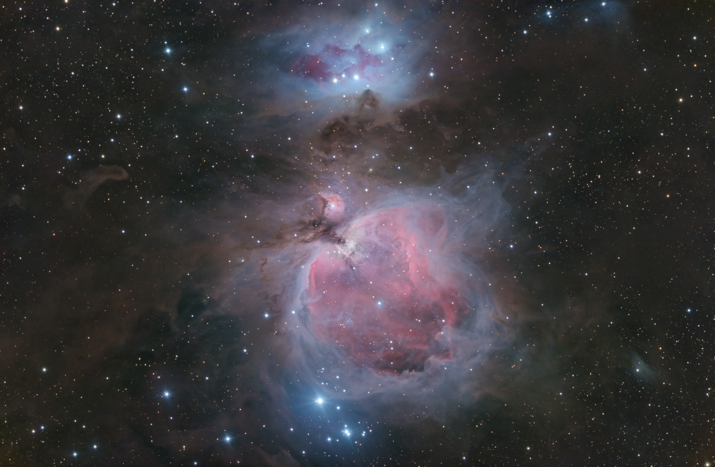 Below, a deeper view made with the same scope at 560mm focal length. The open cluster at top is NGC 1981. Click on the image for a larger version.
