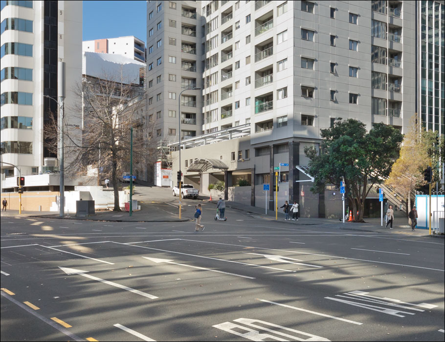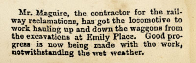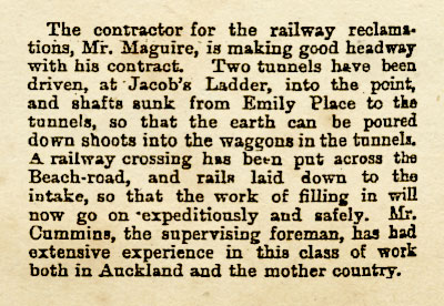 Nor is there any sign in the 'then' image of 'Jacob's Ladder', the stairway from Customs Street to Emily Place atop Point Britomart visible at left in the picture above; this absence, and the locomotive and tunnels seen in the 'then' image, seem to be explained by the 1884 newspaper report below: