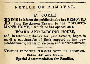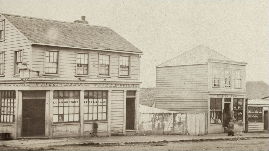 The corner of Federal (then Chapel) Street is at left. The Aurora Tavern, seen at left in the 1860s picture, seems to have been first mentioned in newspapers of the period in 1853. In the 1860s photograph the proprietor's name over the door is P.Coyle; he is first mentioned in the local press in connection with the tavern in 1866.1 (In 1865 the proprietor was given as one Patrick South in another newspaper report.2) In July 1868 Coyle announced that he was leaving the Aurora Tavern and setting up another establishment, the Sportsman's Home - see below.3 It's likely then that the 1860s photograph was taken between 1866 and '68.