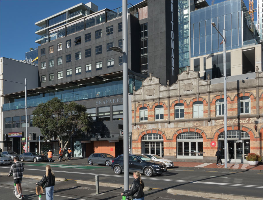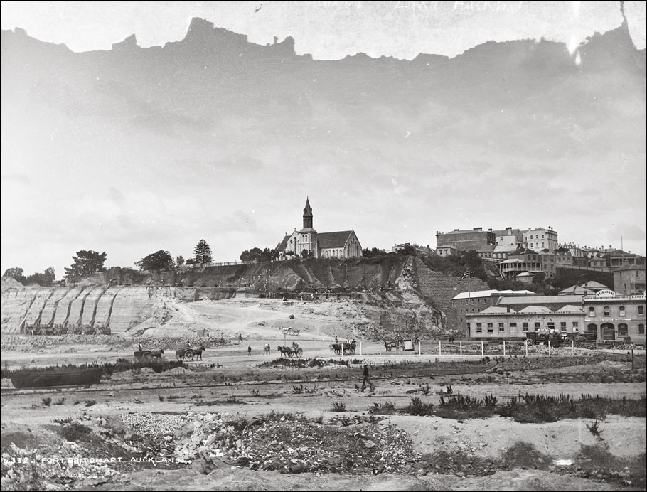 The demolition of Point Britomart, which had begun in the 1870s, was advancing toward St Paul's church near the top of Shortland Street (seen here at centre) by the time of this Burton Brothers photograph. The date must be later than 1883 as this picture was clearly made some time after a photograph of the waterfront made in that year (of which there is a then-and-now treatment on this site here). And the date can be no later than 1885 as it was in that year that St Paul's church was demolished.