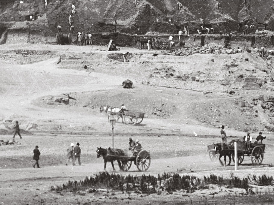 In the detail below, the massive retaining wall seen left of centre was built in the early 1880s only to be partially destroyed by a disastrous landslide in 1883. For more on this (and a view of the landslide) see the 1883 waterfront image mentioned above here.